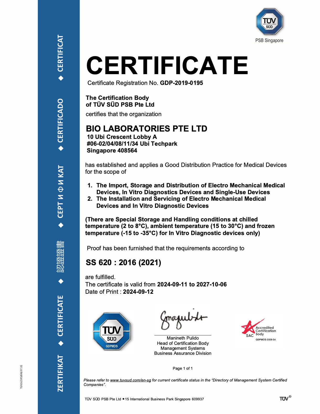 The 1st layer the system comprises of validated cold chain equipment such as Fridge and Freezers as well as controlled ambient. The cold chain equipment is maintained and serviced to ensure they continue to perform optimally. The 2nd layer is the personnel interacting with the temperature sensitive products. They have been trained to ensure safe handling of temperature sensitive goods. A 24 hours cold chain monitoring system makes up the 3rd layer. This system operates in real-time wirelessly to monitor the storage temperature and any deviations from pre-set alarm limits. It will activate SMS alerts to assigned personnel and will further escalate to different personnel should the SMS not be acknowledged within a pre-set time limit. The entire system is designed with a business continuity concept in mind. Any potential risk of failure in the cold chain ecosystem is mitigated by using technical alarms specifically designed for electrical power interruption, SMS module, network & monitoring PC failure. The 4th layer consists of procedures and checks implemented under the Quality System. With the 4 layers working together, we achieved our objective to protect the products. BioLab has licences for the importation and wholesale of Medical Devices in Singapore and certified to meet BizSAFE Level 3.